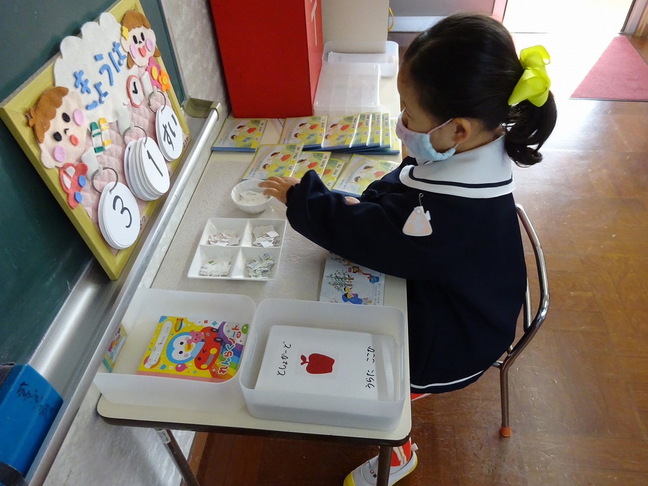 | 出席のシールを貼ったり、いろいろ・・・。 お着替えもします。 |