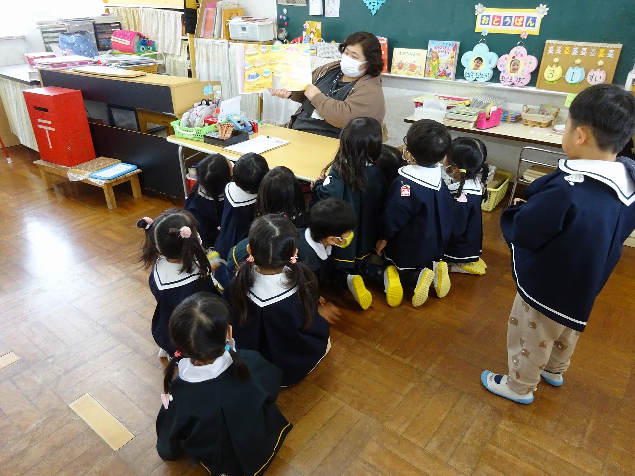 ![]() 先生のお話があります。 「きょうもいっしょにたのしく すごしましょう!」 |